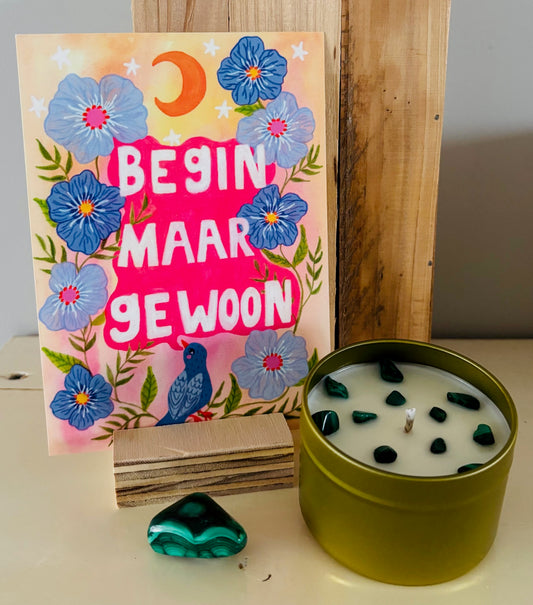 Van het plakken van de lont, tot het plaatsen van de steentjes. Ik maak alles zelf en verpak jouw kaars tot een prachtig cadeau.