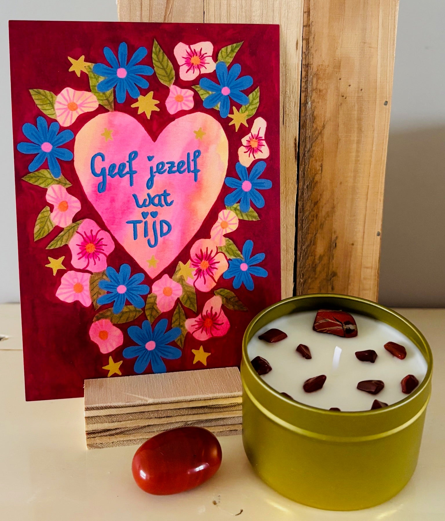 Een betekenisvol cadeau voor iedere gelegenheid. Handgemaakte, natuurlijke geurkaarsen & waxmelts van Roos. Geurkaarsen gemaakt van sojawas & waxmelts van koolzaadwas. Met etherische oliën van Groene Linde Heiloo en Natuurzuiver van Lotus Diffusers in Noord-Scharwoude. Versierd met betekenisvolle steentjes.