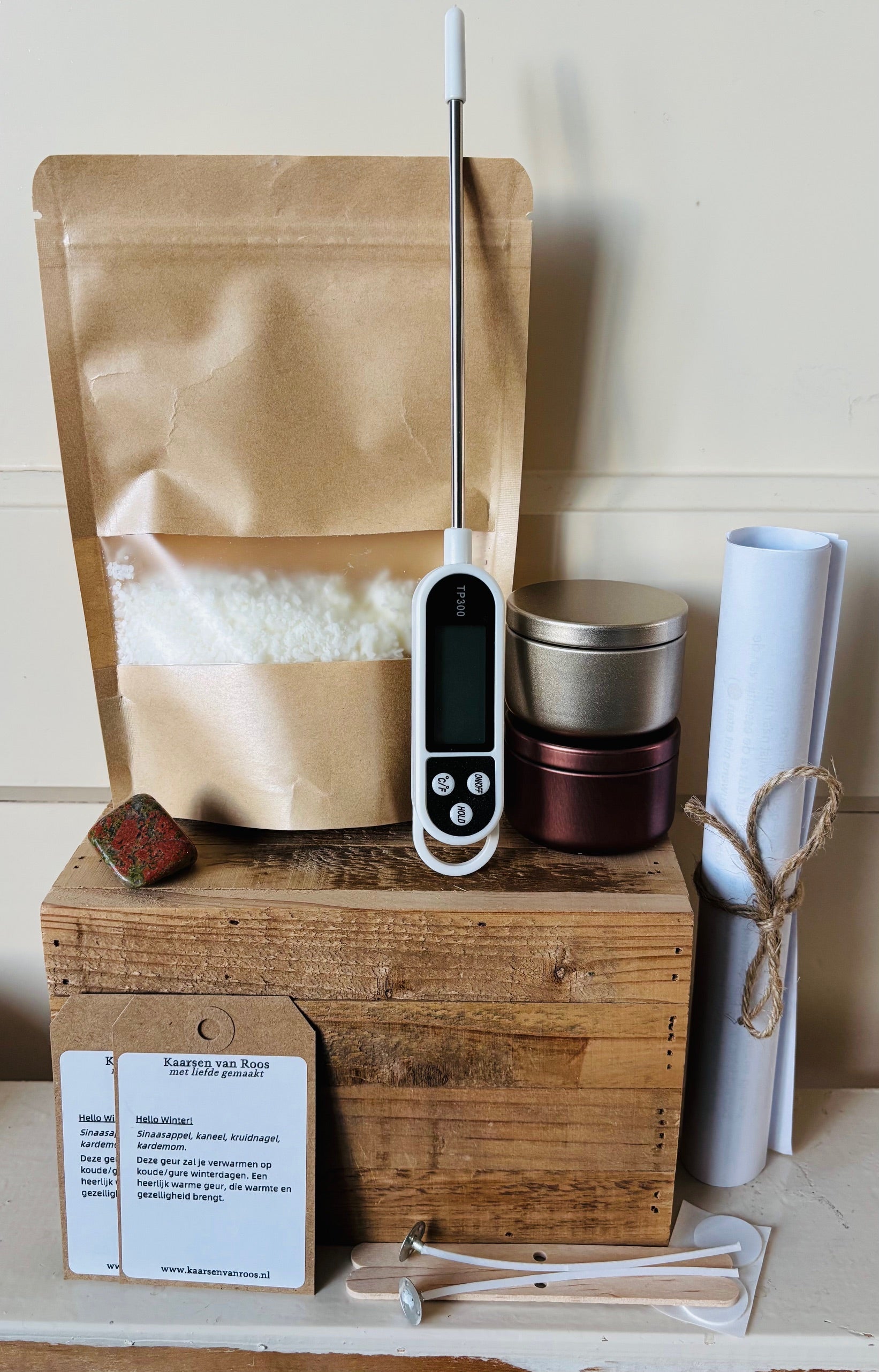 Inhoud pakket: sojawas, etherische olie, 2 blikjes, 2 lonten, 2 lontstickers, 2 lontstokjes, 2 betekenislabels, knuffelsteen, stappenplan.