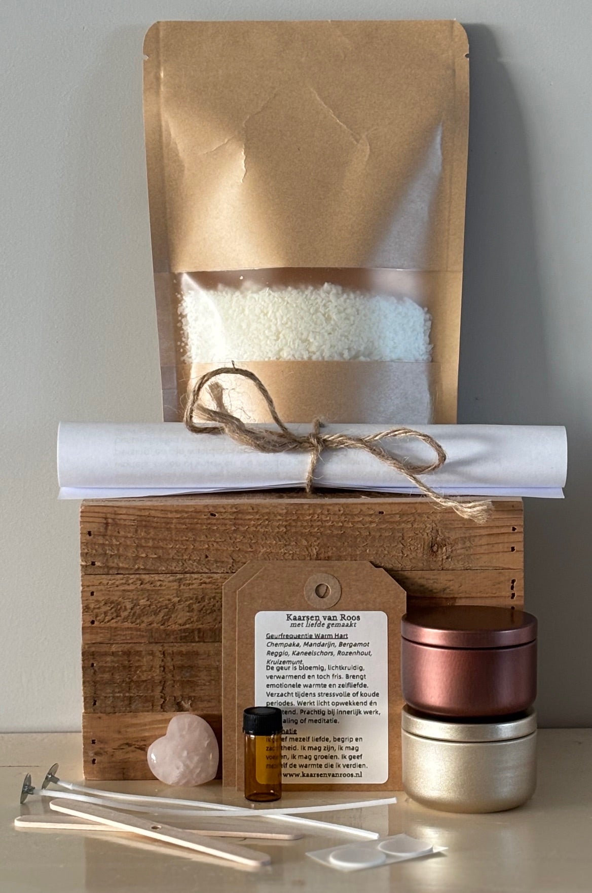 Inhoud pakket: sojawas, etherische olie, 2 blikjes, 2 lonten, 2 lontstickers, 2 lontstokjes, 2 betekenislabels, knuffelsteen, stappenplan.
