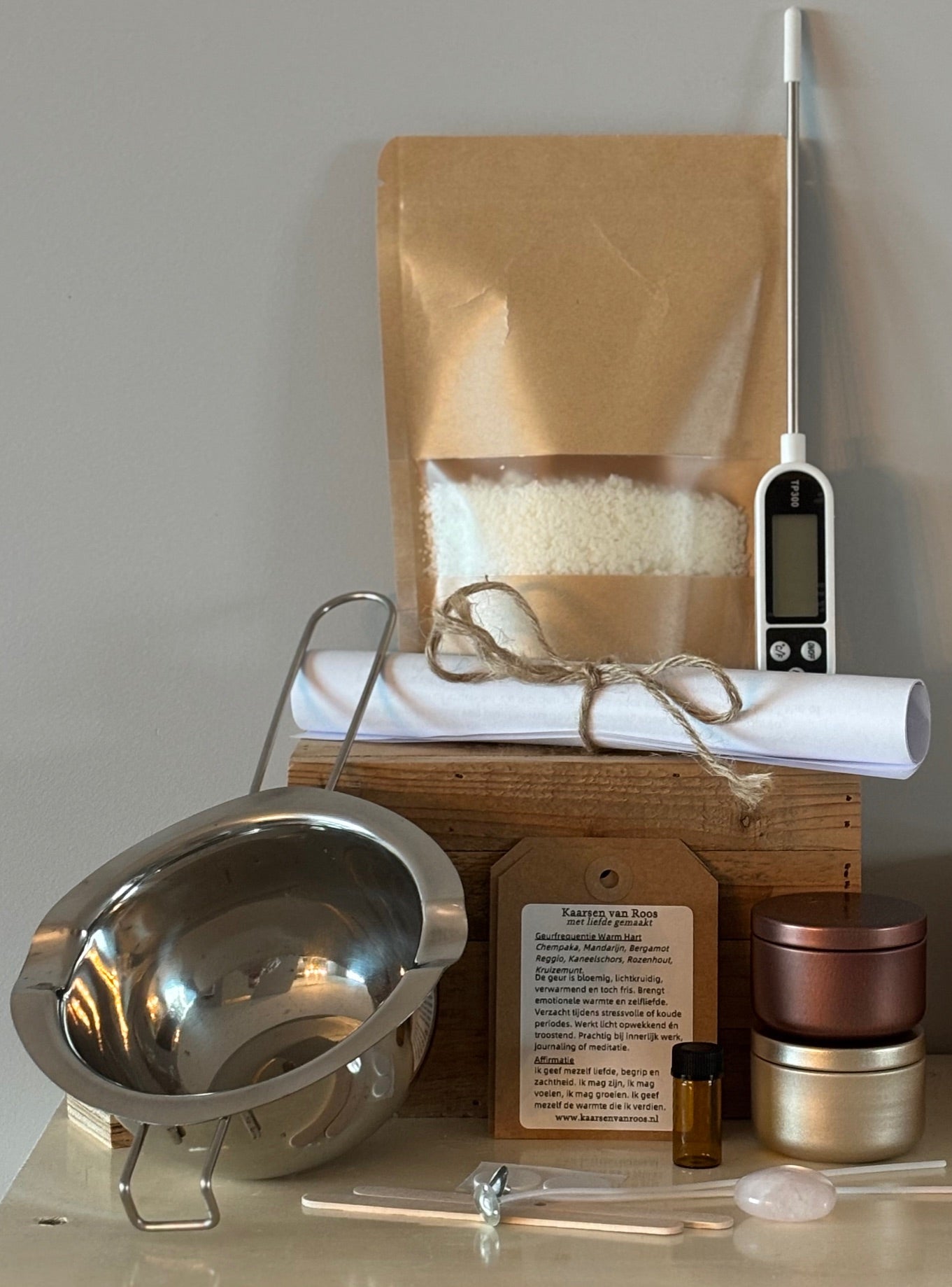 Zelf toevoegen: warmtebron, pannetje water, kannetje/smeltpannetje (of kies voor een pakket mét thermometer en smeltpannetje).