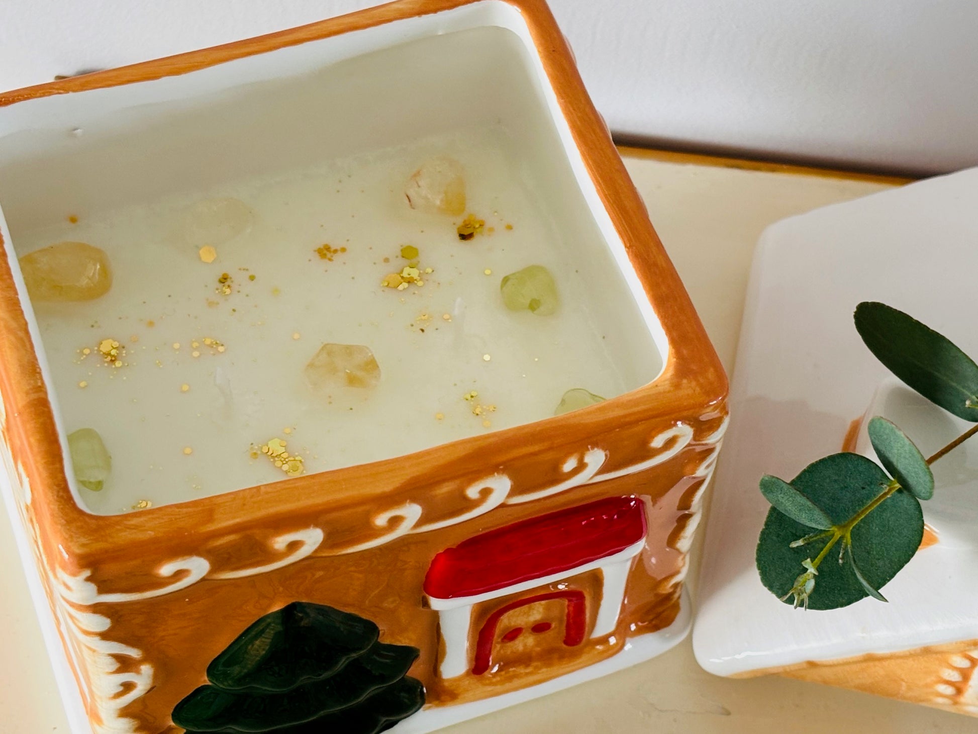 Een keramiek Cookie Kersthuisje, gevuld met een heerlijke warme geurkaars.