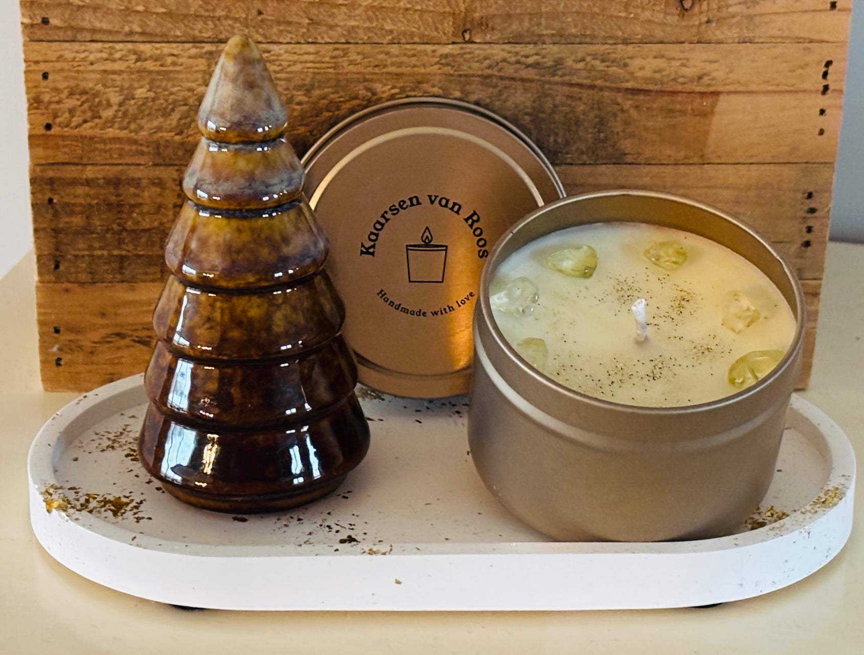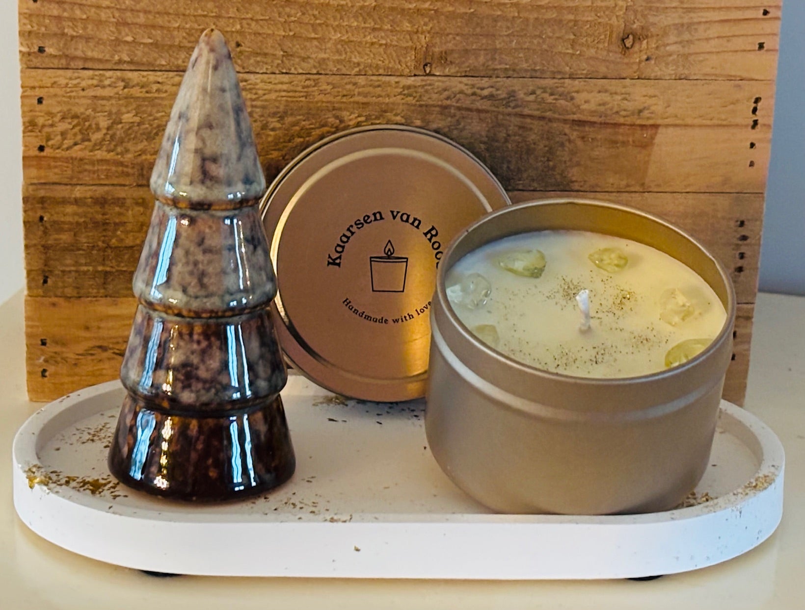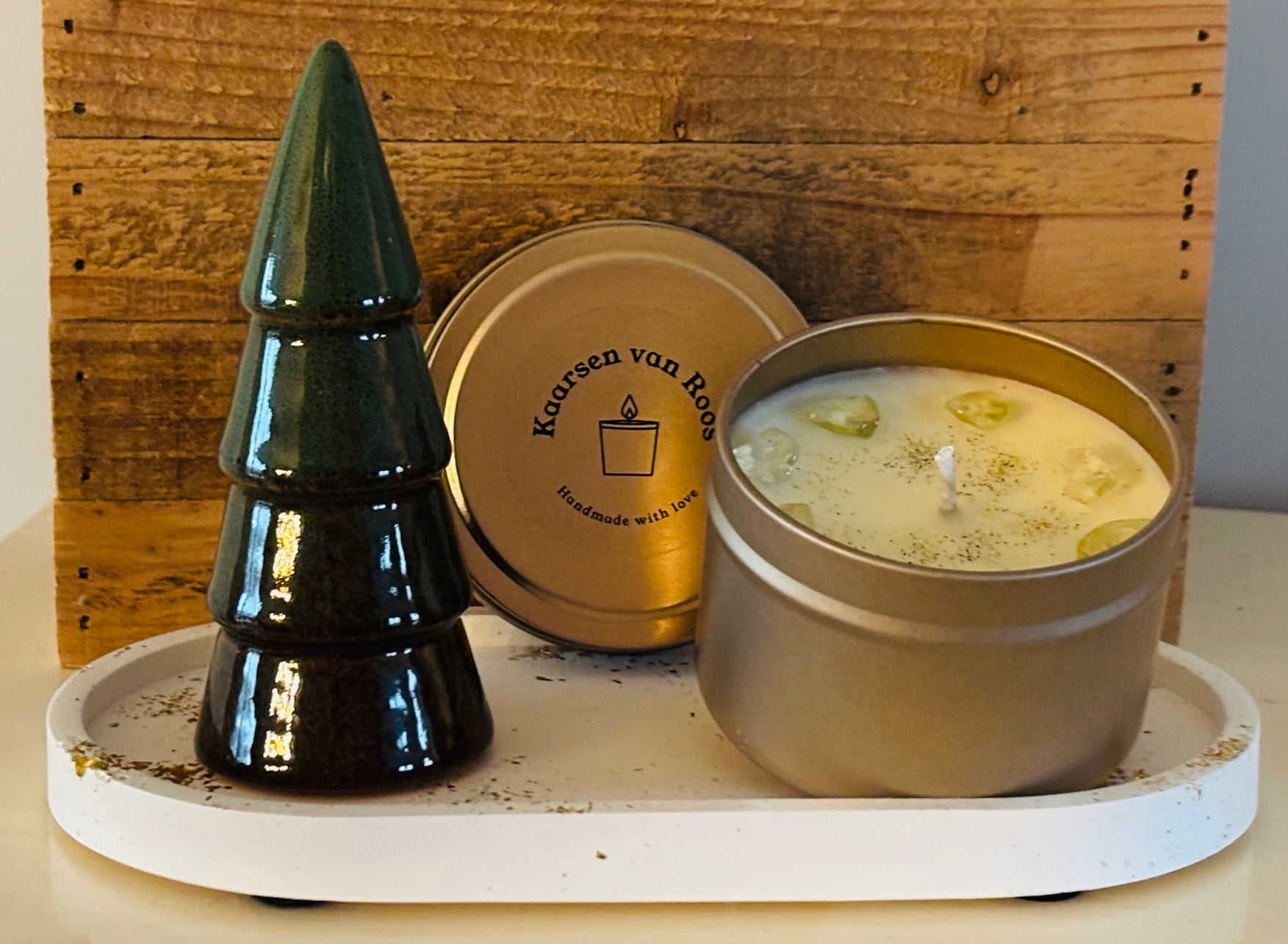 Een prachtig keramiek plateau (wit/goud) met stenen kerstboom en heerlijke kerstkaars. Een uniek en betekenisvol cadeau!