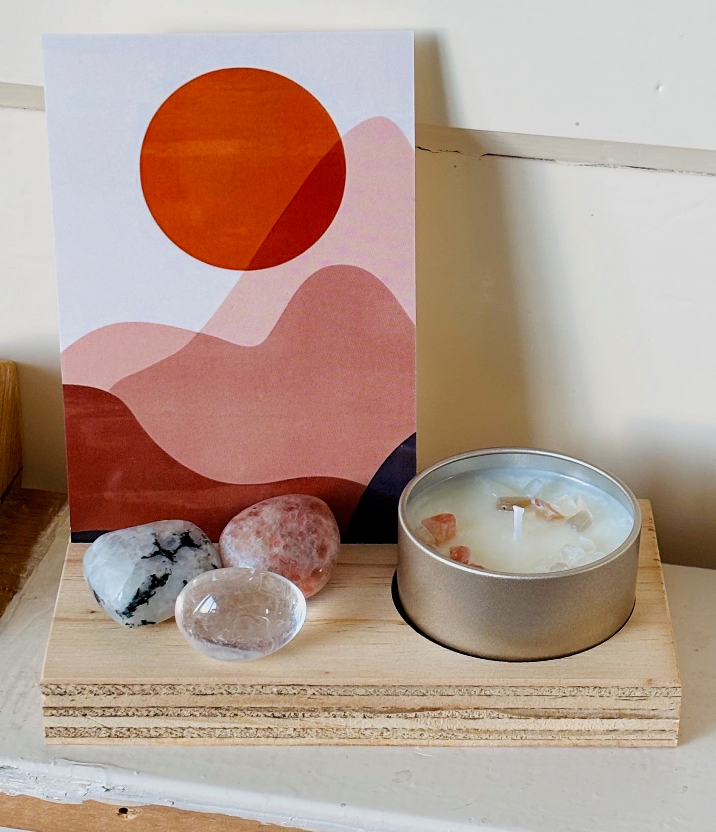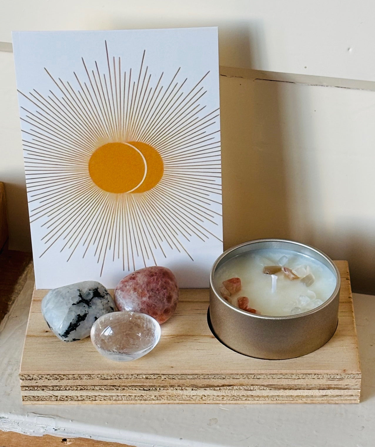 Een krachtig altaar plankje met kaart, kaars en kristallenset.
