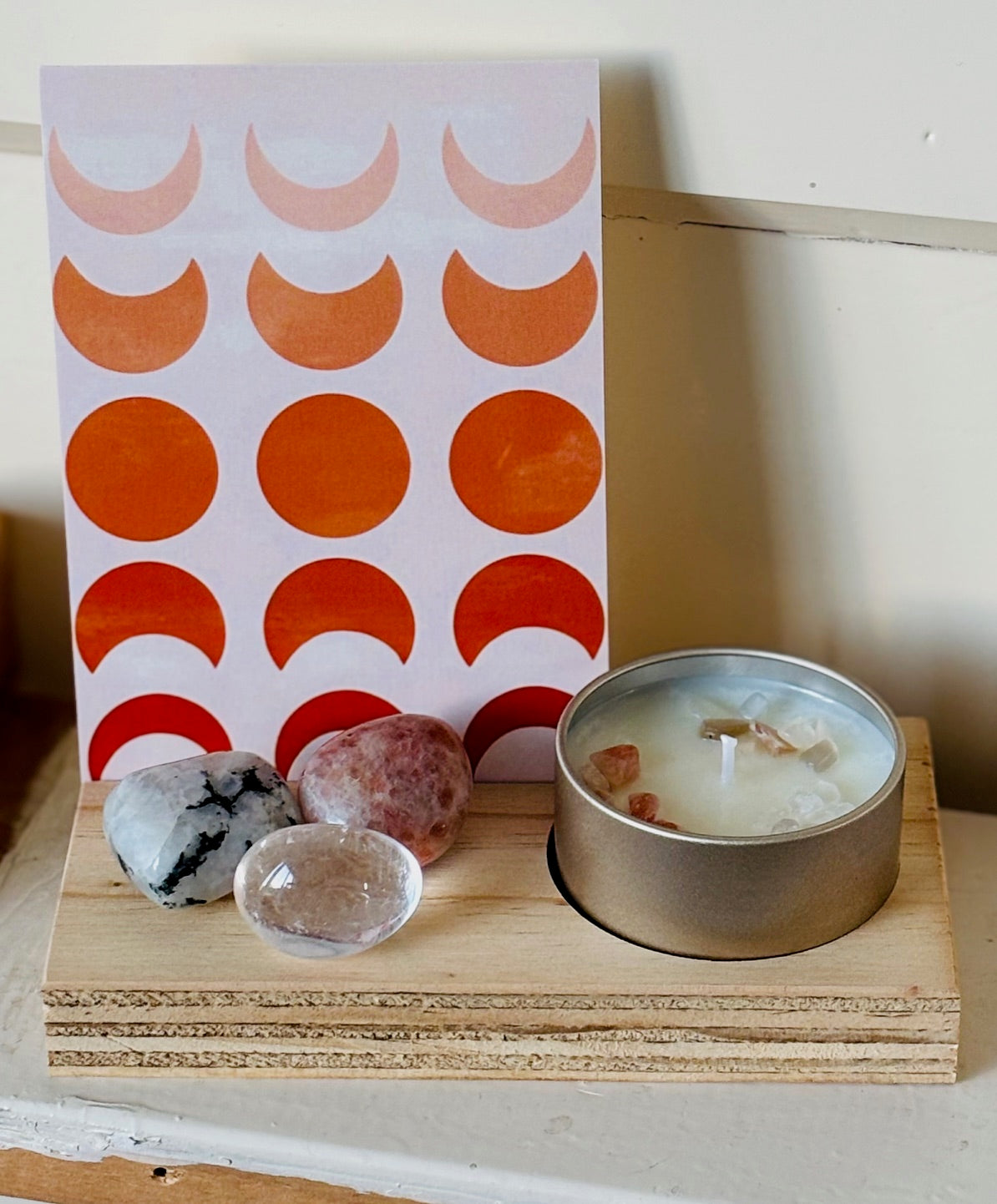 De kaars bevat maansteen, zonnesteen en bergkristal en heeft de geurfrequentie Power of the Moon. Bergamot Reggio, Lavendel, Chempaka 10%, Vanille, Spar, Kardamom, Benzoë. Werkt ondersteunend bij de kracht van de volle maan. Maak jezelf weerbaar en vind je balans terug.