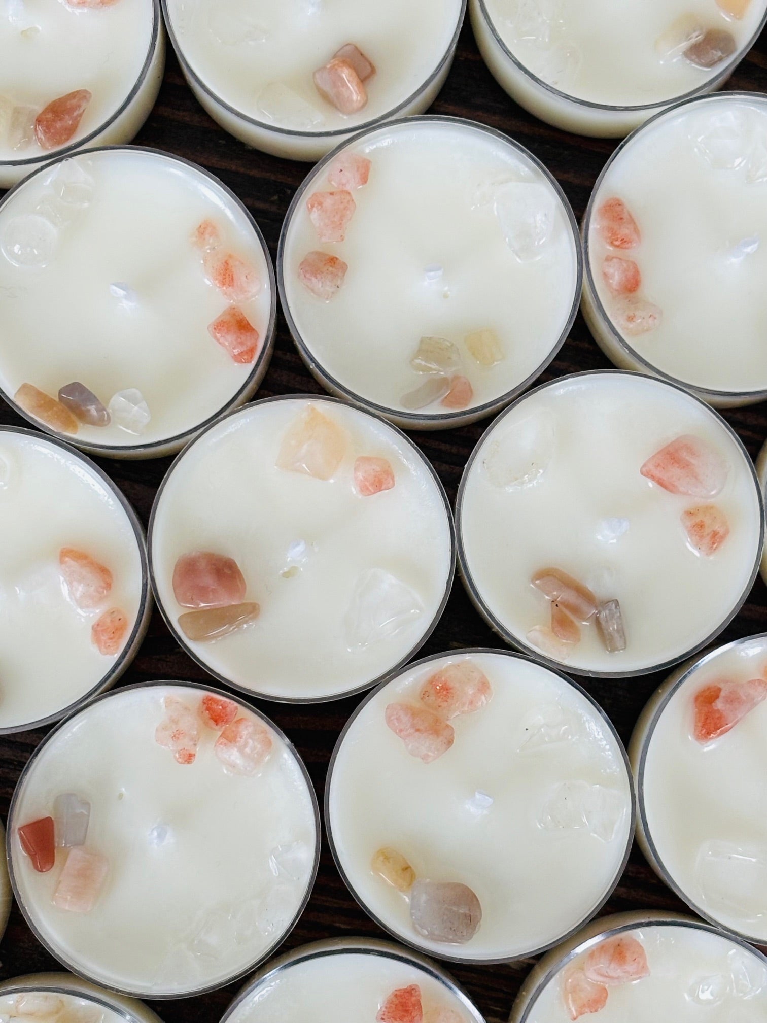 Power of the Moon waxine kaarsjes versierd met Zonnesteen, Bergkristal en Maansteen. Een perfecte combinatie om je te ondersteunen bij de periode voor de volle maan.